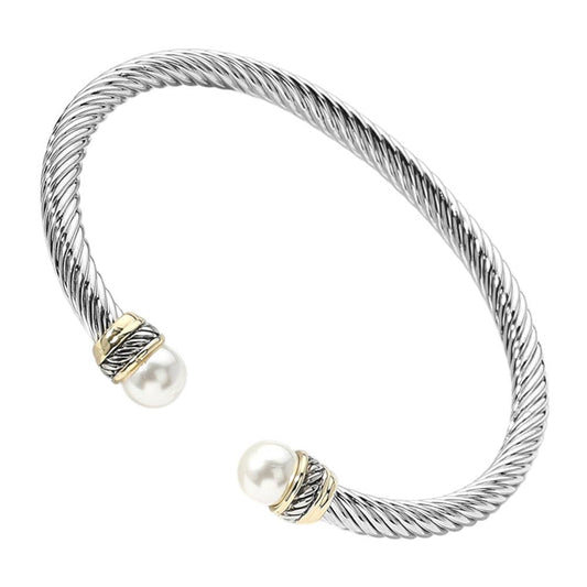 Pearl Tip Two Tone Twisted Metal Cuff Bracelet