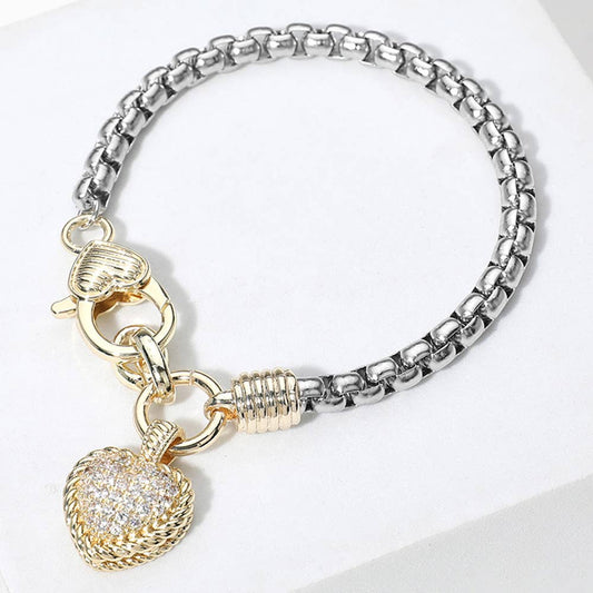 Two Tone CZ Stone Heart Charm Bracelet